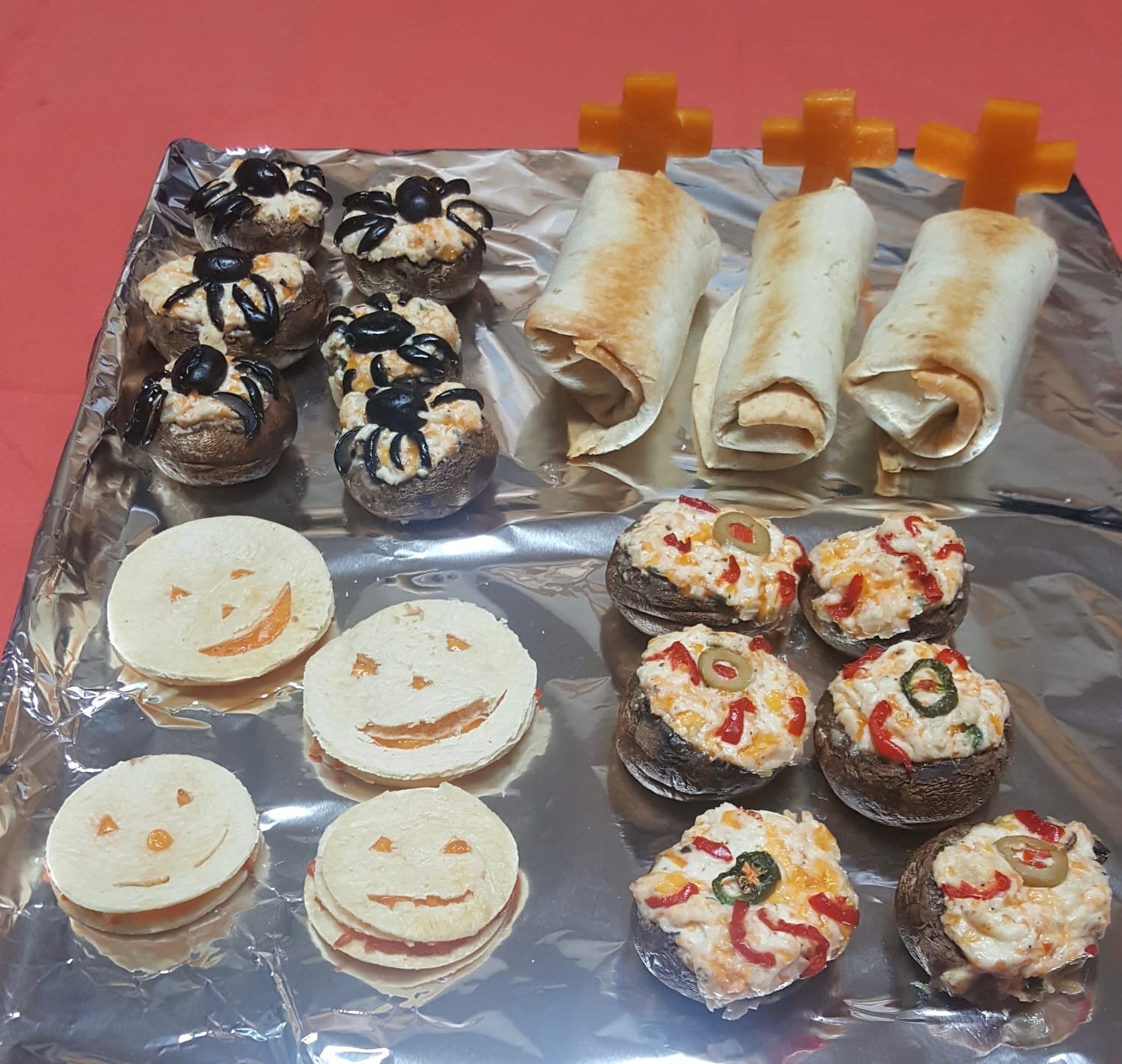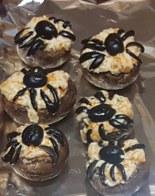 Fill mushroom caps with seasoned cream cheese or hummus, then top with black olive “spider” bodies and legs.