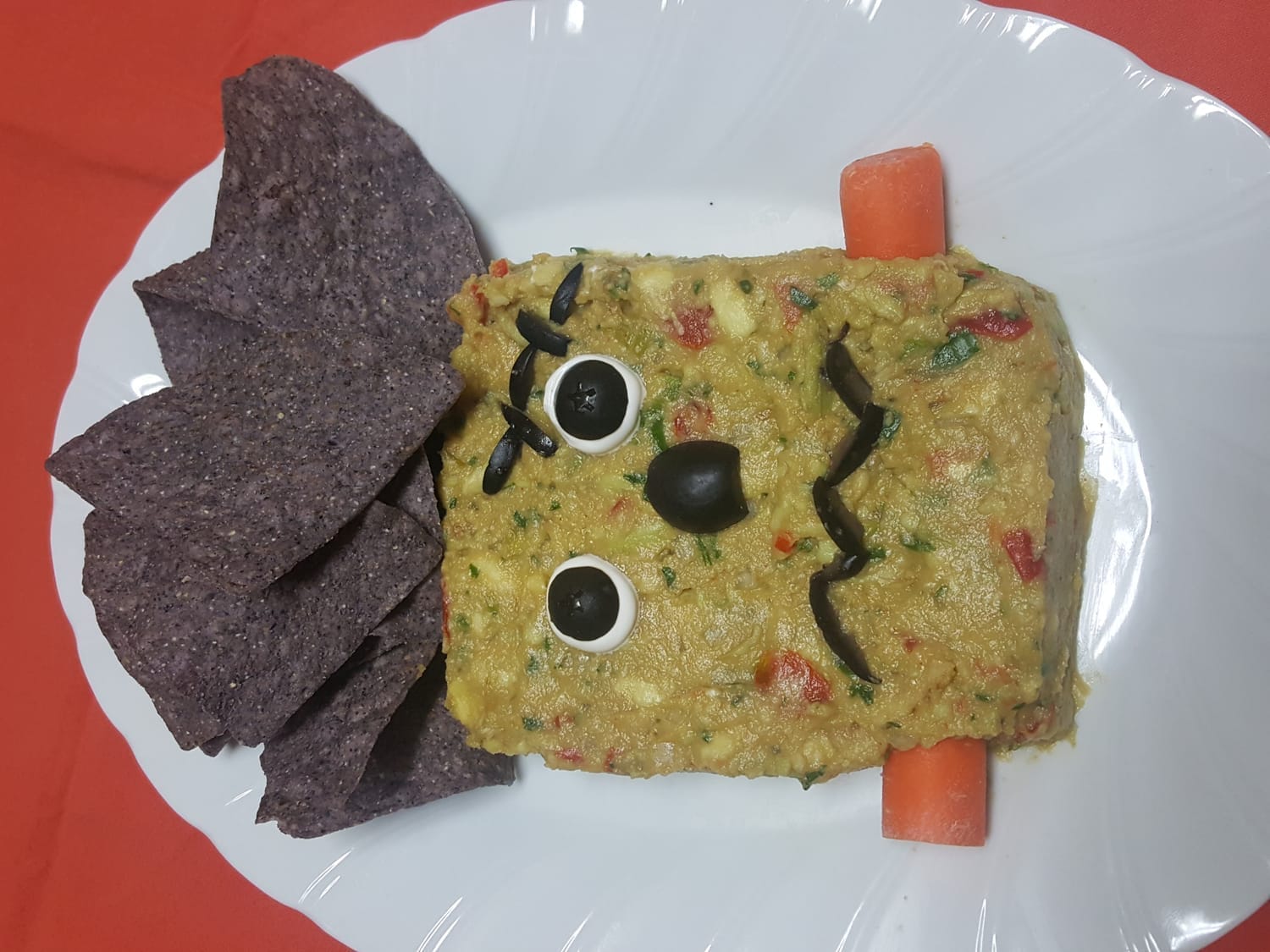 Spread guacamole in a shallow dish and use black beans, olives or blue corn chips for hair and mouth. Use cheese sticks, cucumbers or carrot pieces for bolts, and sour cream or Greek yogurt dotted with olives for eyes.