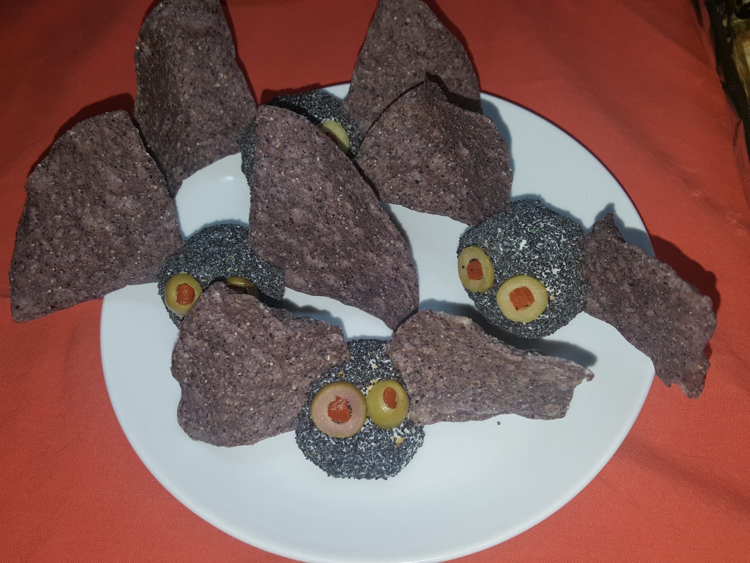 Form mini balls of herbed cream cheese, roll in crushed black sesame seeds or poppy seeds, and press two blue corn chips in for wings. Add olive slice “eyes.”
