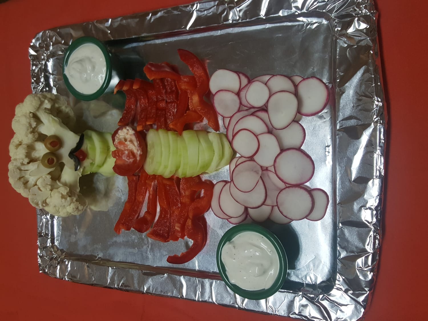 Lay out sliced veggies like carrots, cucumbers, celery, and bell peppers in the shape of a skeleton. Use cherry tomatoes for joints and a small bowl of hummus or ranch dip for the “head.”